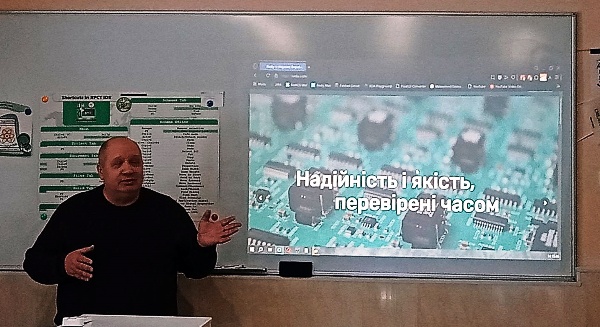 Перед здобувачами освіти виступив з лекцією керівник відділу верифікації НВП «Радікс», доктор технічних наук, професор Олег Одарущенко, який також є стейкхолдером освітньо-професійної програми «Комп’ютерна інженерія». Він розповів студентам історію підприємства, про основні напрями його діяльності, останні розробки.