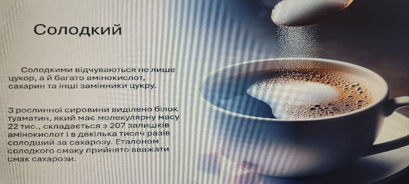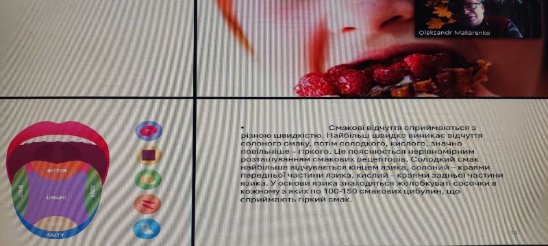 Під час лекції було розглянуто базові смаки їжі: солодкий, кислий, солоний, гіркий та умамі, їх фізіологічну природу та значення для організму людини. Особливу увагу лектор приділив тому, як саме рецептори язика сприймають різні смакові подразники та як формується загальне враження від їжі.