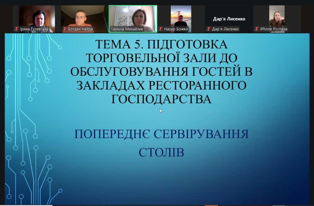 У ВСП «Полтавський фаховий коледж НУХТ» відбулося показове дистанційне заняття в групі 41-ТХ з дисципліни «Організація обслуговування в закладах ресторанного господарства» на тему «Попереднє сервірування столів», його провела викладачка Таміла Михайлик.