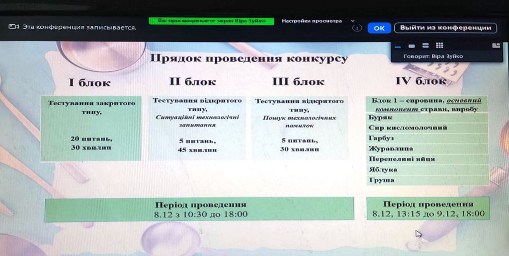 - IV блок – приготування конкурсної страви з рослинної сировини, яка визначена шляхом жеребкування. Цим методом визначався тип закладу ресторанного господарства та вид страви/виробу.