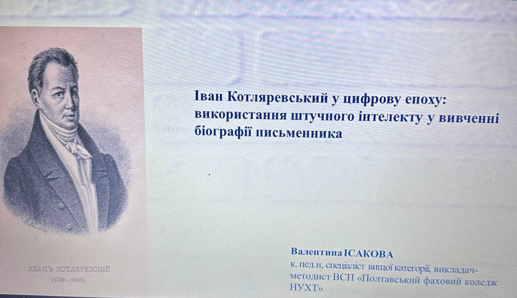 Викладачка коледжу Валентина Ісакова взяла участь у роботі Круглого столу з доповіддю «Іван Котляревський у цифрову епоху: використання штучного інтелекту у вивченні біографії письменника».