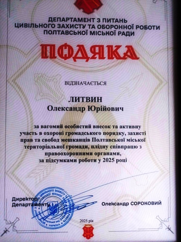 Викладачу дисципліни «Основи правознавства» Відокремленого структурного підрозділу «Полтавський фаховий коледж Національного університету харчових технологій» Олександру Литвину була вручена Подяка від Департаменту з питань цивільного захисту та оборонної роботи Полтавської міської ради за вагомий особистий внесок та активну участь в охороні громадського порядку, захисті прав та свобод мешканців Полтавської міської територіальної громади, плідну співпрацю з правоохоронними органами, за підсумками роботи у 2025 році.