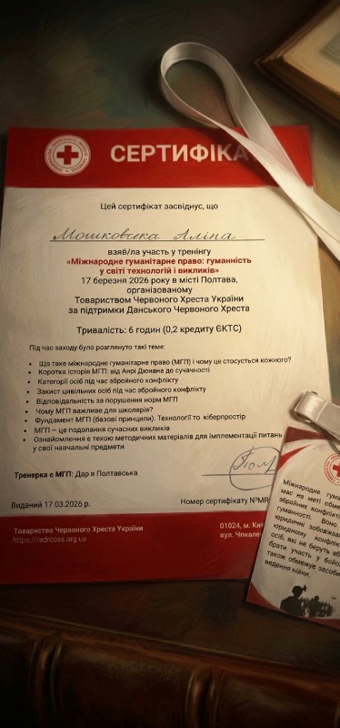 17 березня 2026 року Полтавська академія неперервної освіти імені М.В. Остроградського у співпраці з Українським Червоним Хрестом організувала для вчителів суспільно-гуманітарних дисциплін та усіх зацікавлених громадян науково-практичний семінар-тренінг «Міжнародне гуманітарне право: гуманність у світі технологій і викликів».